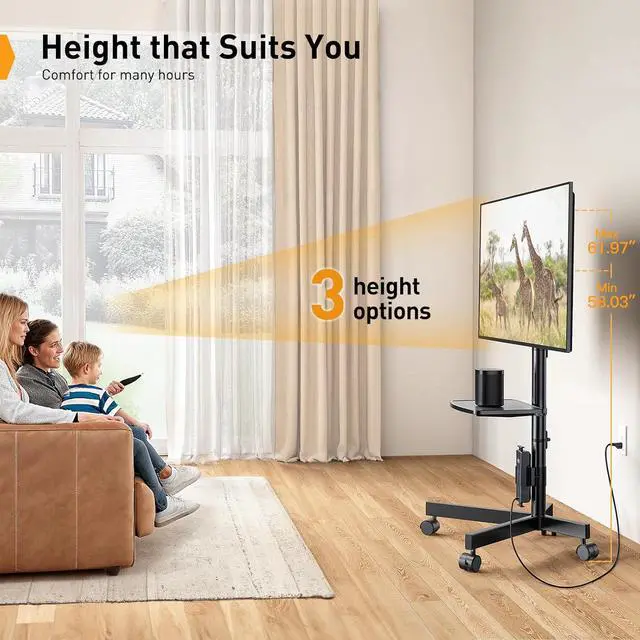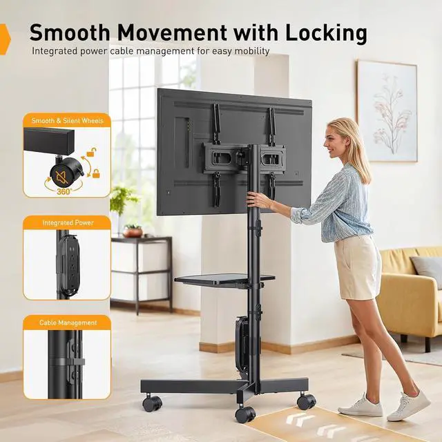 Clip-On Integrated Power Supply: Our rolling TV stand features a built-in power outlet with two USB ports (5V/2.1A), three AC ports (120V/12A), and a 6.6ft power cord for easy connection to wall outlets. The included cable management system helps keep your space neat and organized.