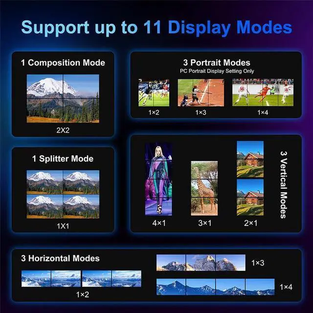 This video wall controller can simultaneously distribute 1 HDMI input to 4 HDMI outputs. It supports 8 Display Modes: 2x2, 1x2, 2x1, 1x3, 3x1, 1x4, 4x1 Video Wall Mode, and 1x4 Splitter Mode. Control options include manual, IR remote control, or RS232 control. Additionally, with the PC in portrait display setting, the TV/monitor can be placed at 90 degrees to use in 1x2, 1x3, and 1x4 modes.