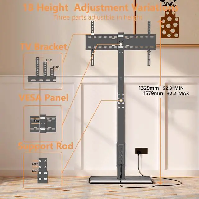 to 62.2 ";: The Floor TV stand with Power Outlet offers 3-position height adjustment for support bar and TV bracket, VESA panel features 2-position adjustment allow for precise position to suit seating preference for optimal viewing angles.