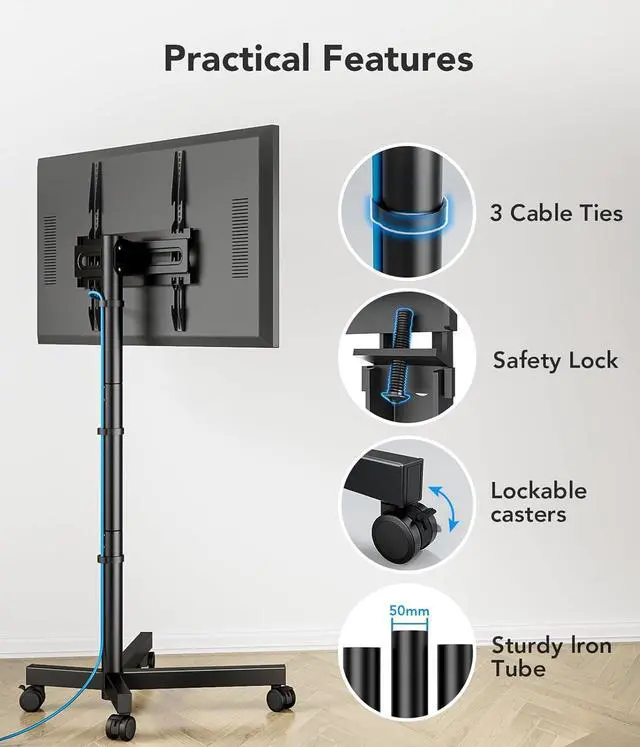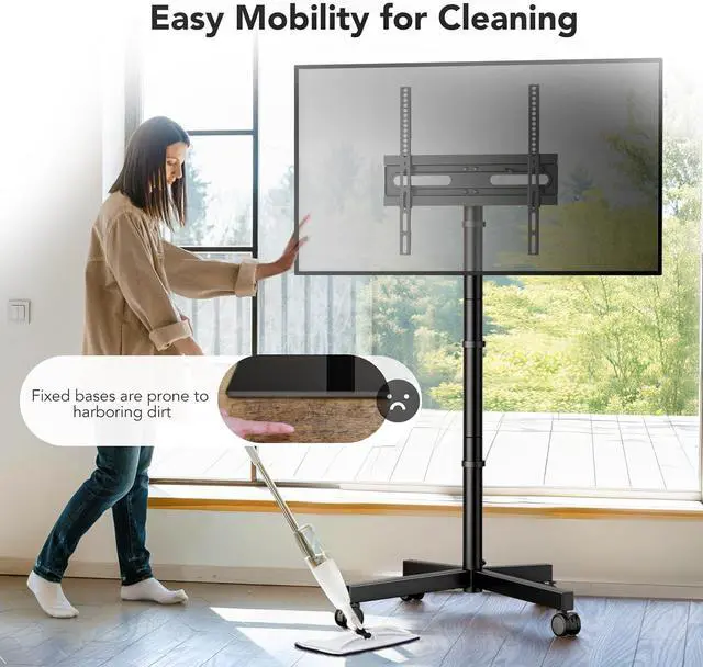 STABLE PORTABILITY: Mobile TV stand wheels with 360 degree rotating provide smoother rolling performance on both hard floors and carpet. Equipped with locking mechanisms, you can easily secure the TV cart in place after transport. Our portable TV stand is carefully crafted with cold-rolled steel and X-shaped base design to enhance its stability
