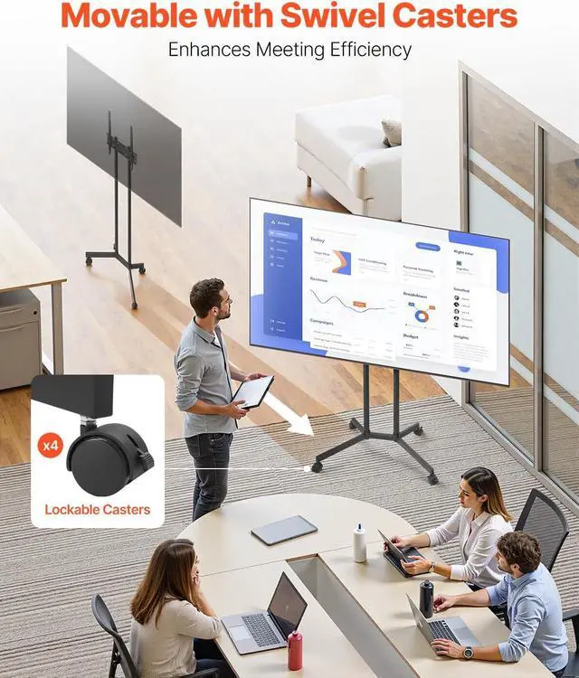 Convenient Mobility: Equipped with swivel wheels, this mobile TV mount allows you to effortlessly rotate to adjust angles or move it to your desired position. You can easily slide it to different spots in the room.