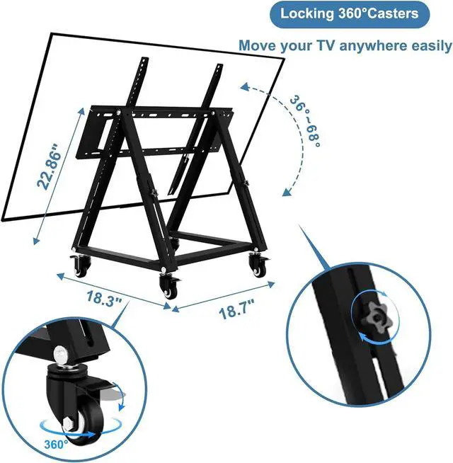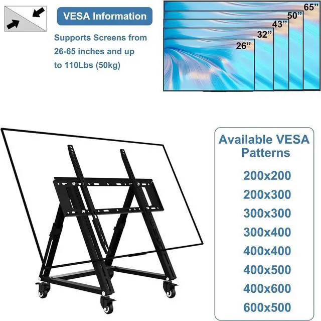 Sturdy and compact TV cartThis heavy duty TV cart uses an ultra-thick steel frame with a carrying capacity of up to 50KG, achieving the most economical and practical goal of being a true portable TV stand; Make sure there are at least 4 mounting holes on the back of the TV/monitor.