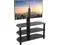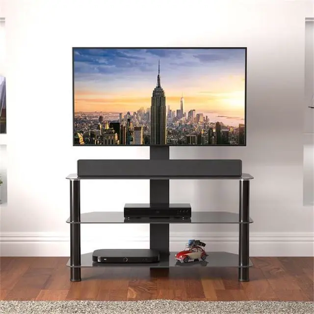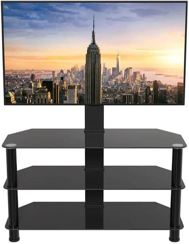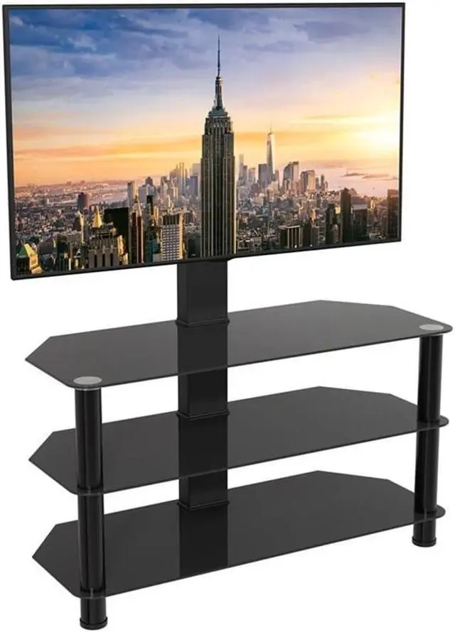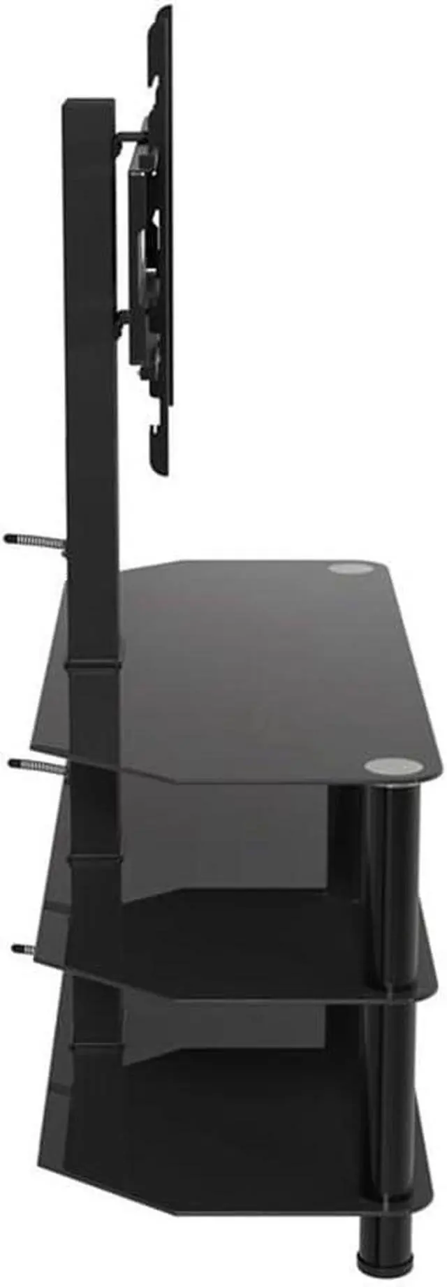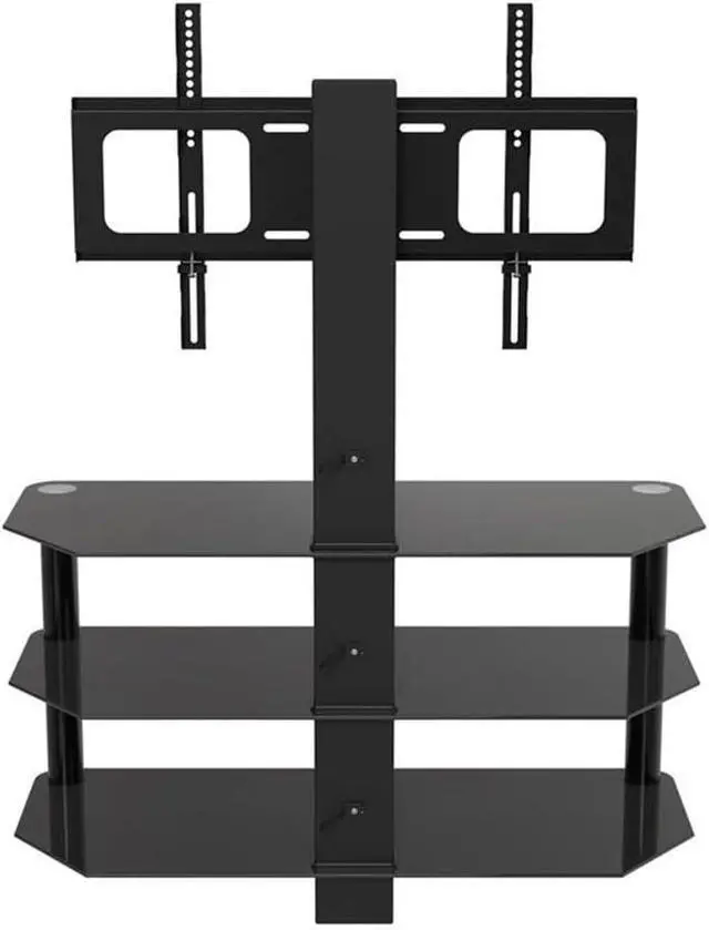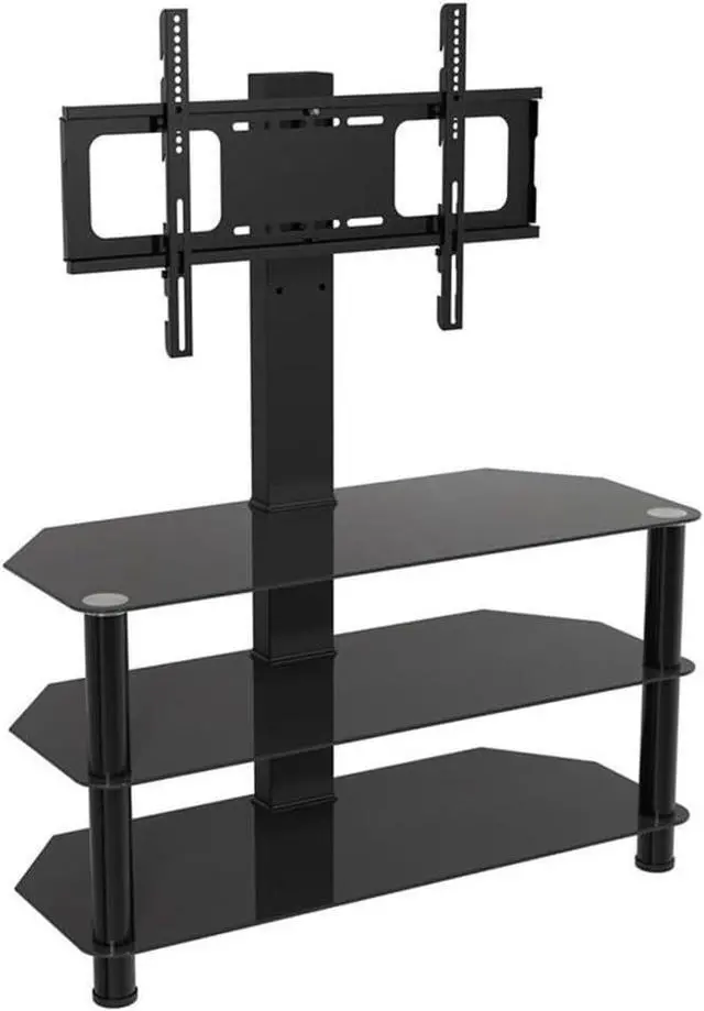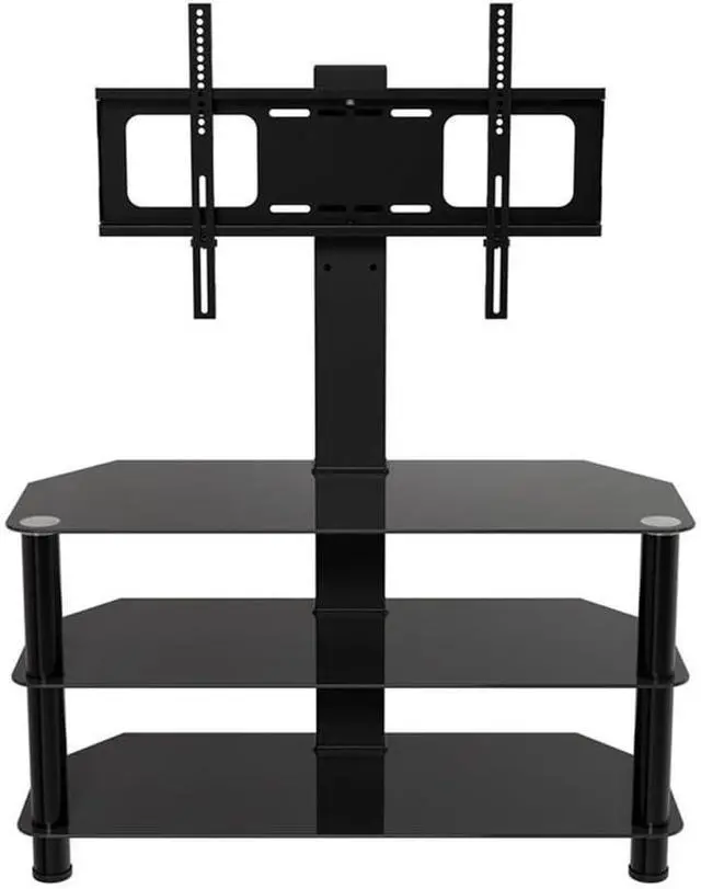 Materials: Steel, glass Finish: Black Supports TVs up to 88 lbs, plus 44 lbs for Middle & Bottom Black Tempered Glass Shelves Angled Back Allows Placement Flat Against a Wall or in a Corner Cable Management via Central Column for a Tidy Appearance