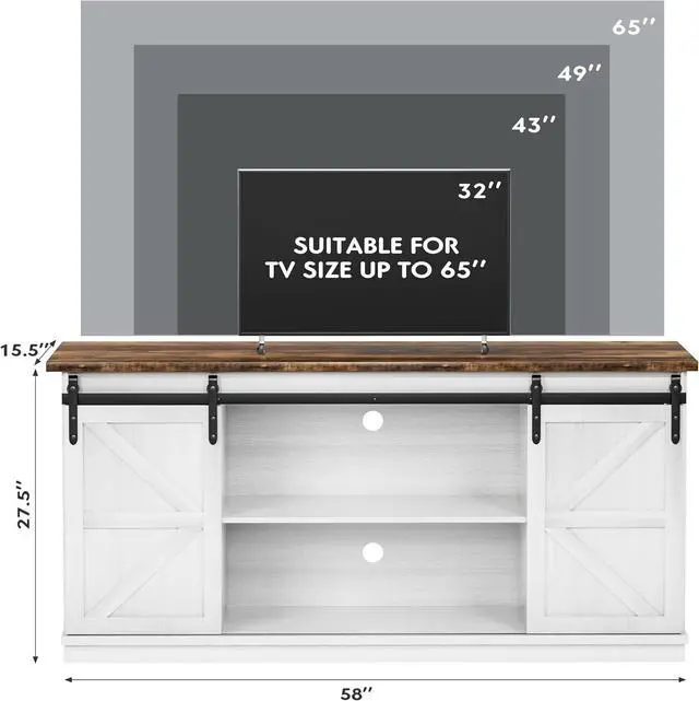TV Stand Size: The size of this TV stand is 27.6 H x 15.5 D x 58 L, and can hold up to 65 inches of TV sets.