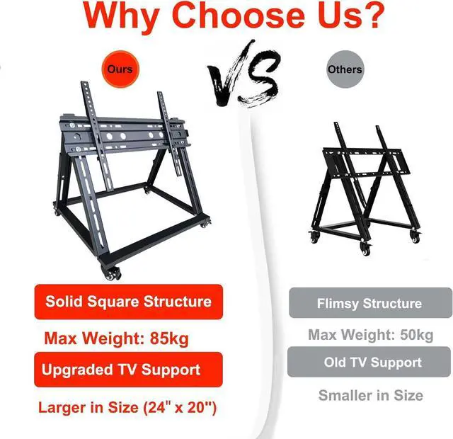ROBUST AND SMALL TV CART: Made of extra thick steel frame, the loading capacity of this heavy duty TV cart is up to 190lbs to achieve both the most economical and practical targets as a real portable tv stand; Pls. make sure there are not less than 4 mounting holes on the back of the TV/monitor;