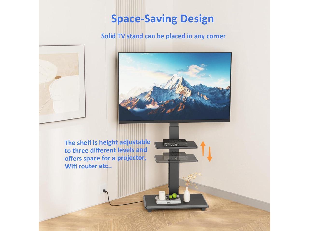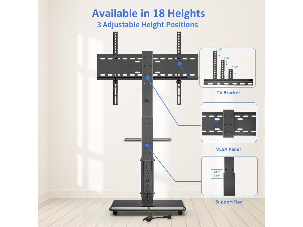 - 18 Adjustable Heights & 30°Left and Right SwivelThe TV stand can be adjusted to 18 different heights. It is designed with 3 TV bracket heights, 3 support rod heights, and 2 TV panel heights. In addition, it has swivel function of ±30° left and right, so it allows you to choose the most comfortable vi