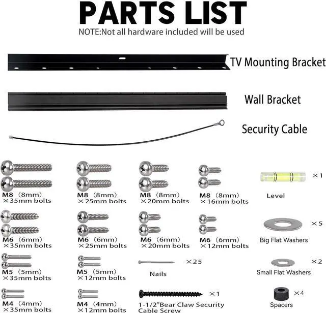 [Package Included] - 1 x TV mounting bracket; 1 x wall bracket; 2 x M8 (8mm x 35mm) bolts; 2 x M8 (8mm x 25mm) bolts; 2 x M8 (8mm x 20mm) bolts; 2 x M8 (8mm x 16mm) bolts; 2 x M6 (6mm x 35mm) bolts; 2 x M6 (6mm x 25mm) bolts; 2 x M6 (6mm x 20mm) bolts; 2 x M6 (6mm x 12mm) bolts; 2 x M5 (5mm x 35mm) bolts; 2 x M5 (5mm x 12mm) bolts; 2 x M4 (4mm x 35mm) bolts; 2 x M4 (4mm x 12mm) bolts; 1 x Bubble Level; 25x nails; 1 x steel cable; 1 x 1-1/2" bear claw security cable screw; 5x big flat washers; 2x small flat washers; 4 x spacers
