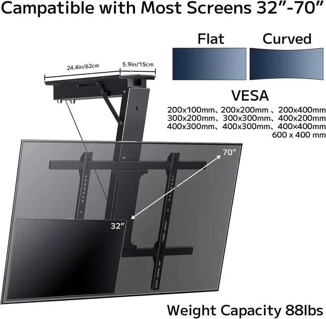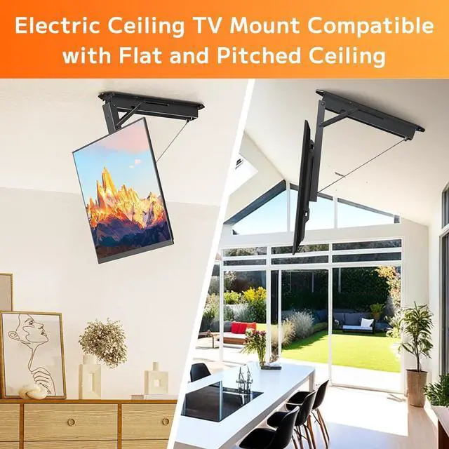 Electric Ceiling TV Mount: Large motorized ceiling TV mount, by holding down the button of remote, can easily raise and lower the position of your TV set with a weight capacity and ultra-strong solid steel to support TVs up to 88 lbs