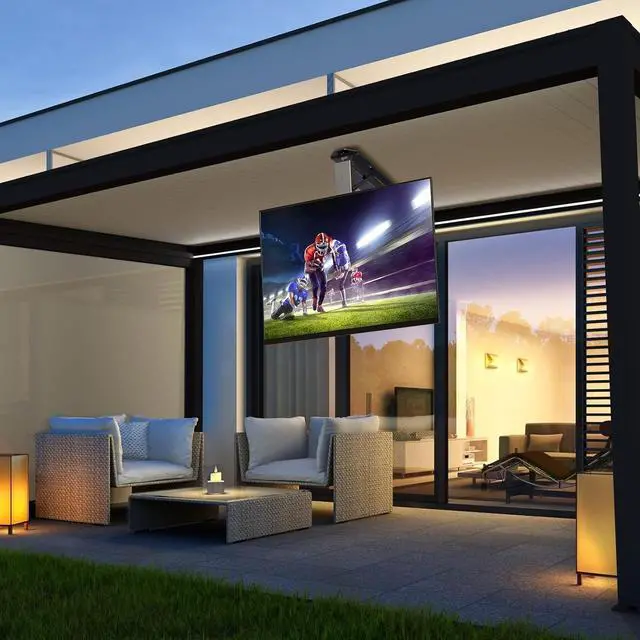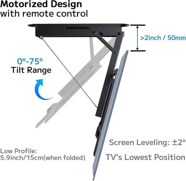 Motorized Flip Down TV Mount: Motorized unfold with a powerful motor. Adjustable 0-75° tilt range for easy storage, cleared up space, and out-of-way safety. +2°/-2° screen leveling to allow for a suitable viewing angles, compatible with flat and pitched roof