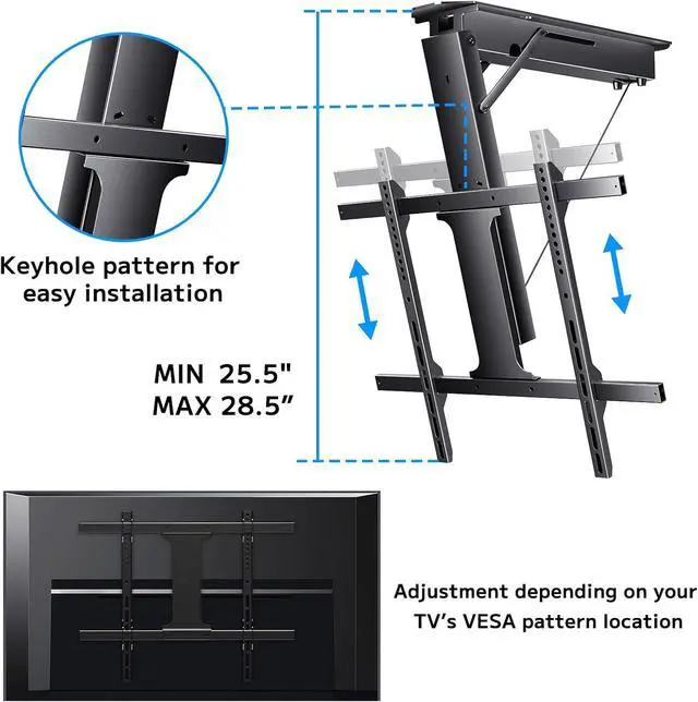 Electric Fold Down TV Bracket: TV mount comes with a handed-remote. The memory function let you can easily find the perfect viewing position time and time again. Perfect for adjusting the TV height based on different activities or viewing preferences