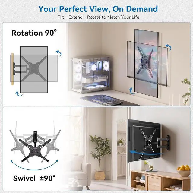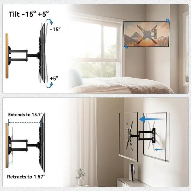 Flexible Full Motion ViewingEnjoy the ideal viewing angle with this full motion tv wall mount. Swivel tv mount swivels left and right up to ±90°, rotates 90° vertically for portrait mode, and tilts from -5° to +15° to reduce glare. Extend it up to 15.7 " for a comfortable view from anywhere in the room, and use the ±3° leveling feature for a perfectly aligned screen