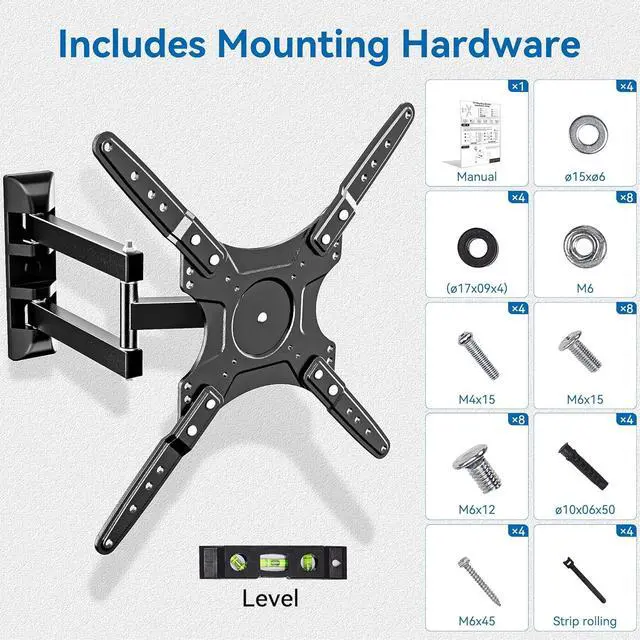 Quick & Easy SetupThis full motion tv mount includes all hardware and clear instructions for a hassle-free setup. Just attach the brackets, secure the wall plate, and hang your TV. Install your swivel tv wall mount in about 10 minutesno special skills required