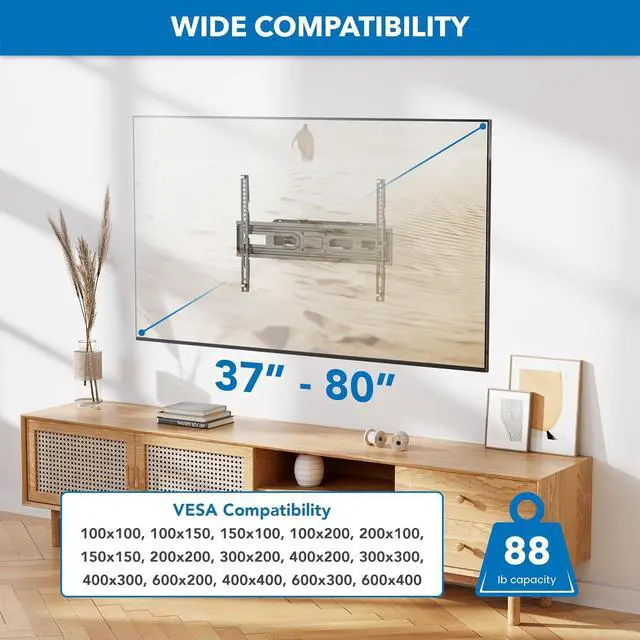 Elevate your viewing experience with smooth, full-motion movement for perfect TV positioning. Compatible with a wide range of displays, supporting sizes from 37" up to 80" and weights up to 88lbs