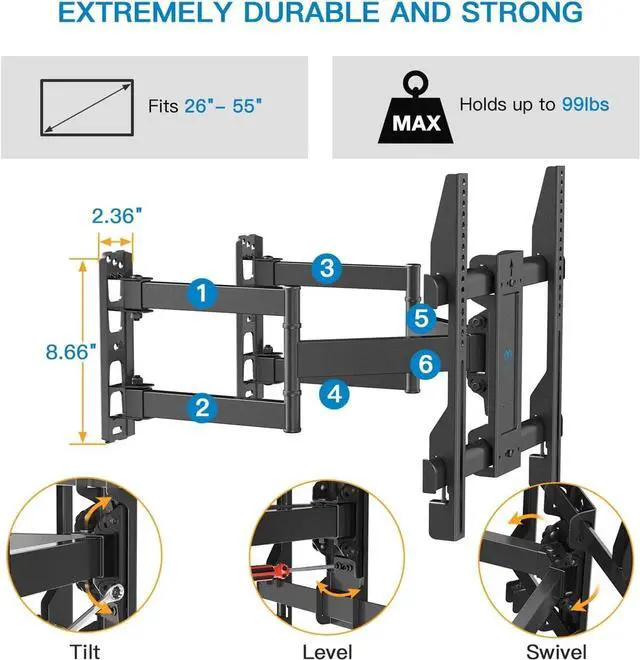 Tilt & Level: Full motion corner TV bracket features a +5°/-10° tilt, 45° swivel (max. swivel angle depends on TV size) and +/-3° level adjustment. Swing it out to your preferred angle, then easily push it back when not in use. Tilt the TV up or down to reduce glare from windows or lights.