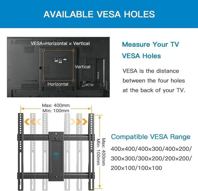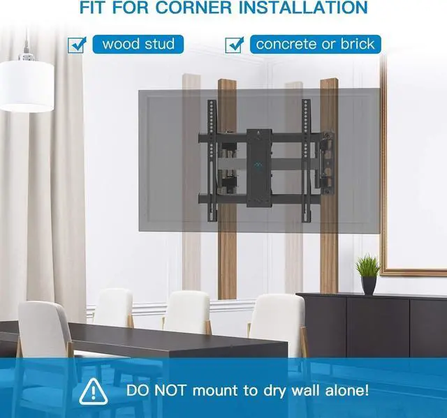 WIDE COMPATIBILITY: Our corner TV bracket fits most 26-60" TVs weighing up to 99lbs/45kgs. Suitable for VESA mounting hole patterns including 200x100mm, 200x200mm, 300x200mm, 300x300mm, 400x200mm, 400x300mm, 400x400mm. If your wood stud spacing exceeds 16 inches, please refer to the 16", 18", 24" wood stud full motion TV mount PSXFK1.