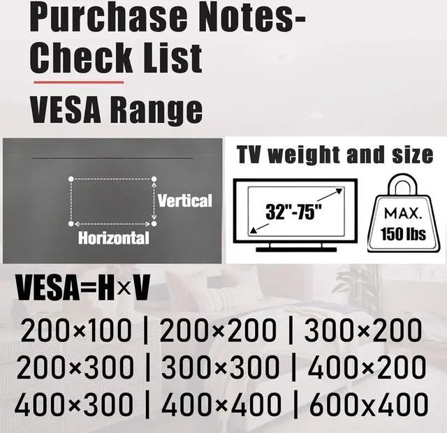 Compatibility with 32 inch to 75 inch TVs Studless TV wall bracket is compatible with a wide range of screens from 32 to 75 inches, It fits major brands like Samsung, Sony, LG, VIZIO, TCL, Hisense, and more. and supports VESA patterns from 200x100mm to 600x400mm
