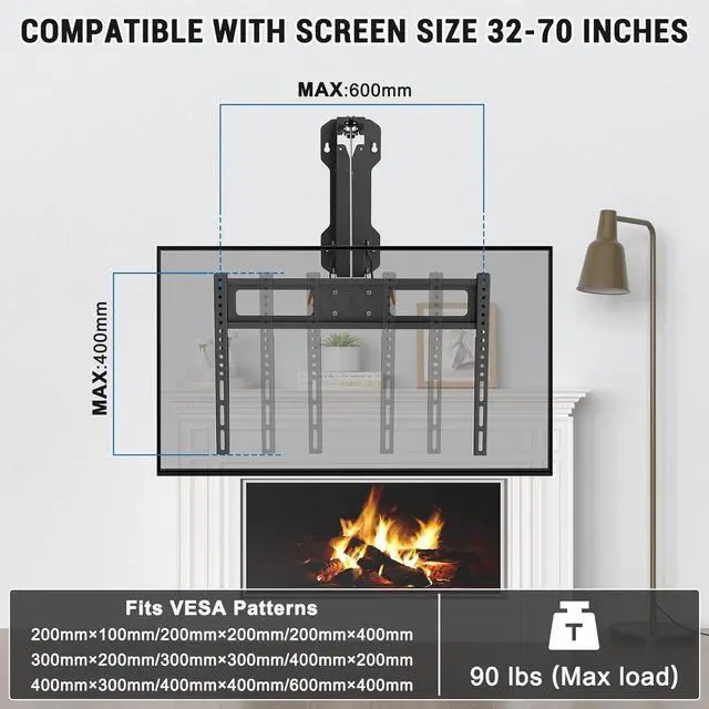 Universal Fit for Large TVsThis fireplace tv mount is compatible with 3270 inch TVs up to 90 lbs, supporting VESA patterns from 200x100mm to 600x400mm for a wide range of models.