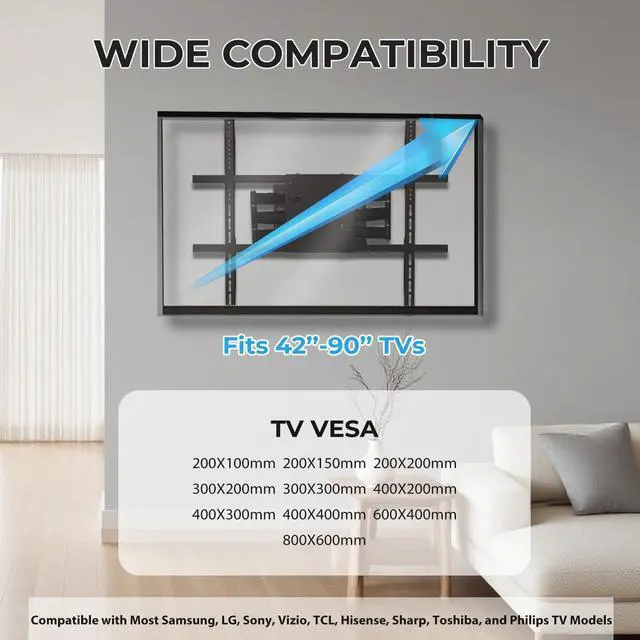 Securely mounts TVs from 32 inches up to 90 inches (verify your VESA pattern in TV specifications before purchase). Supports VESA mounting patterns up to 800 x 600mm. Works perfectly as a Samsung full motion TV mount, Sony full motion TV mount, Vizio full motion TV mount, and most major brands. Built for Heavy, Premium TVs No Sag, No Flex
