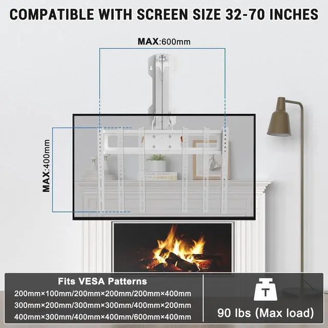 Universal Fit for Large TVsThis fireplace tv mount is compatible with 3270 inch TVs up to 90 lbs, supporting VESA patterns from 200x100mm to 600x400mm for a wide range of models.