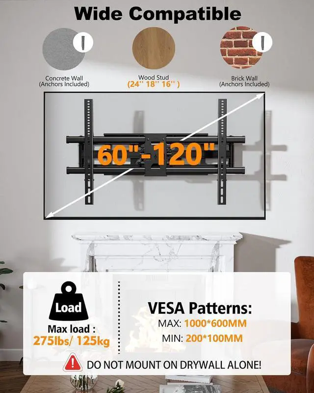 Wide Compatibility Wall Mount TV Bracket: This swivel TV wall mount fits most 60-120 inches flat curved screen LED LCD TVs, especially monitors sizes 65, 70, 75, 80, 85, 86, 90, 95, 98, 100, 110, 120 inch ultrawide monitors with VESA patterns 200x200mm up to 1000x600 mm and holds up to 275 lbs. this large tv mount can be mounted on 16-24 inch wood studs and concrete or brick walls.