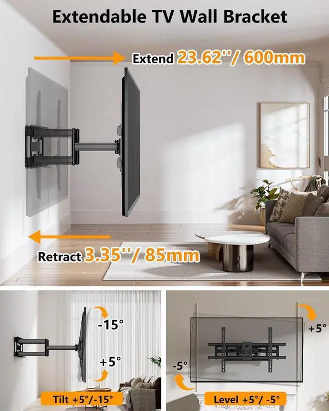 Full Motion TV Wall Mount: Encompassing a 180° swivel range, a tilt angle of 15° down or 5° up, and a ±3° level adjustment after installation, this articulating TV wall mount designed with 6 swivel and tilt arms for smooth, flexible movement ensures optimal positioning for your TV. Whether you' re combating bright lights or finding the perfect viewing angle, upgrade your viewing experience with ultimate flexibility.