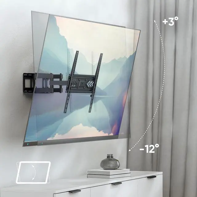 Flexible Viewing Angles This articulating TV wall mount provides 180° swivel and +3° to -12° tilt adjustment, helping reduce glare on the screen and improve visibility. The TV wall mount swivel and tilt function makes it easy to find a comfortable viewing angle from anywhere in the room.