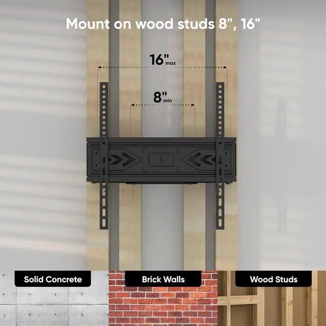 Universal Compatibility The STE644-B full motion TV wall mount fits 32 - 65 inch screens up to 99 lbs. This TV holder wall supports VESA patterns from 100x100 to 400x400 mm and fits 8" or 16" wood studs, offering a practical and reliable solution for mounting televisions in homes, offices, or commercial settings.