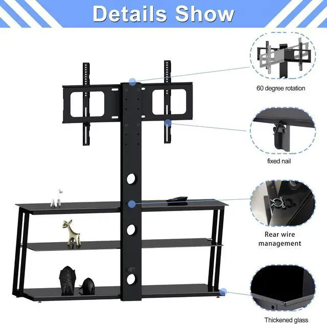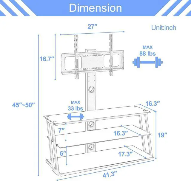 ADJUSTABLE-3 Steps Height Adjustable Option, TV STAND Height From 45' ' to 50". The Hanger Can Rotate 30° Left And Right.