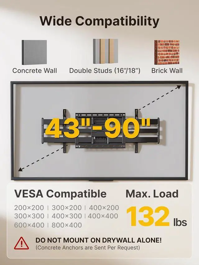 TV WALL MOUNT COMPATIBLITY: This Full Motion TV wall mount fits for most of 43-90 inch LCD/LED/OLED 4K flat screen or curved TVs with VESA patterns 200x200 mm up to 800x400 mm and up to 132 lbs. Designed for installation on 16" /18" wood studs, concrete, and brick walls. (Do not install the mount on drywall alone! ) Perfect for TV installation in living room, kitchen, bedroom, office or any other place