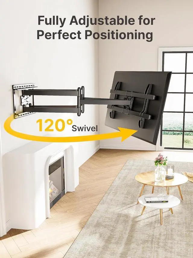ULTIMATE VIEWING EXPERIENCE: Encompassing a 120° swivel range, a tilt angle of 12° down or 3° up, and a ±3° level adjustment after installation, this articulating wall mount tv bracket designed with 6 swivel and tilt arms for smooth, flexible movement ensures optimal positioning for your TV. Whether you' re combating bright lights or finding the perfect viewing angle, our long arm tv wall mount effortlessly reduces glare and covers every seat in the room. Upgrade your viewing experience with ultimate flexibility.