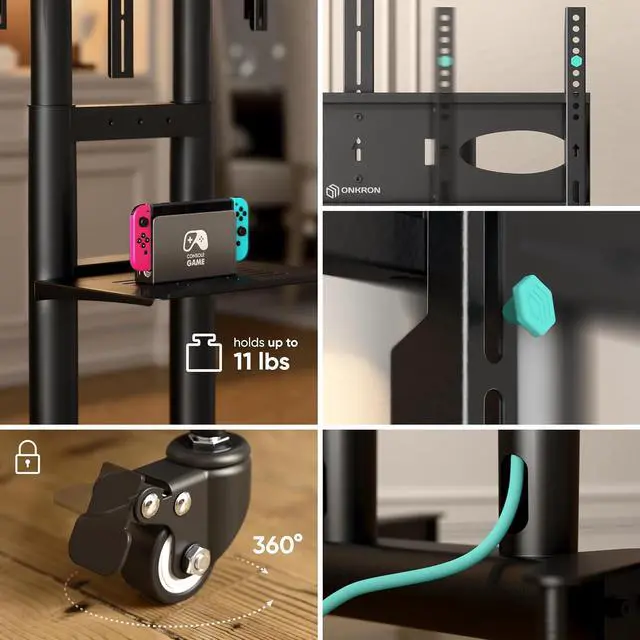 Easy Mobility The TV stand rolling cart features rubberized lockable wheels for effortless movement across rooms or event locations. Its moveable TV stand design is compact and demountable allowing quick assembly and convenient transportation to a new workspace or exhibition. Functional Shelf & Device Support The moving TV stand with wheels has a height adjustable steel shelf that holds up to 11 lbs supporting laptops media players or conferencing equipment. The upper webcam shelf transforms the stand into a mobile TV cart indispensable for video calls or hybrid meetings in any environment. Quality and Support ONKRON mobile TV carts and portable TV stands on wheels undergo multi-stage testing and arrive in sturdy packaging.