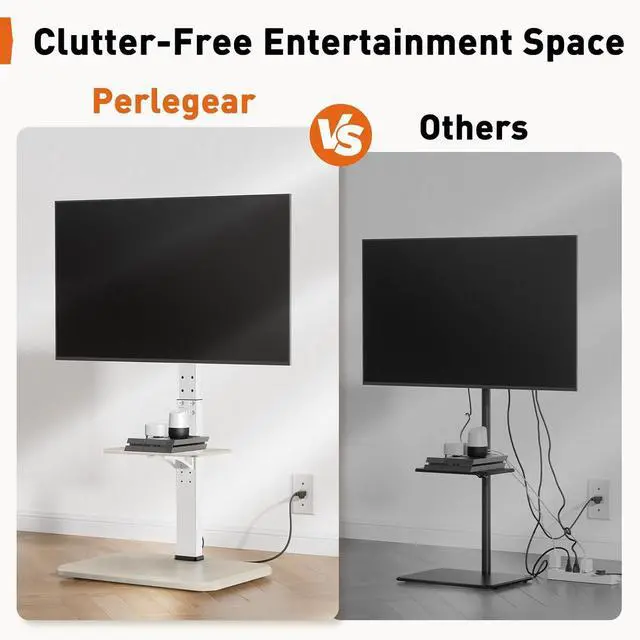 Integrated Power Outlet: The Perlegear floor TV stand is equipped with an integrated power outlet on the back with 2 USB ports (5V/2A) 3 AC outlets (120V/12A) and a 6.5 ft power cord. The Tall TV stand can easily power multiple devices ensuring a more streamlined look without the need for extra outlets or cables.