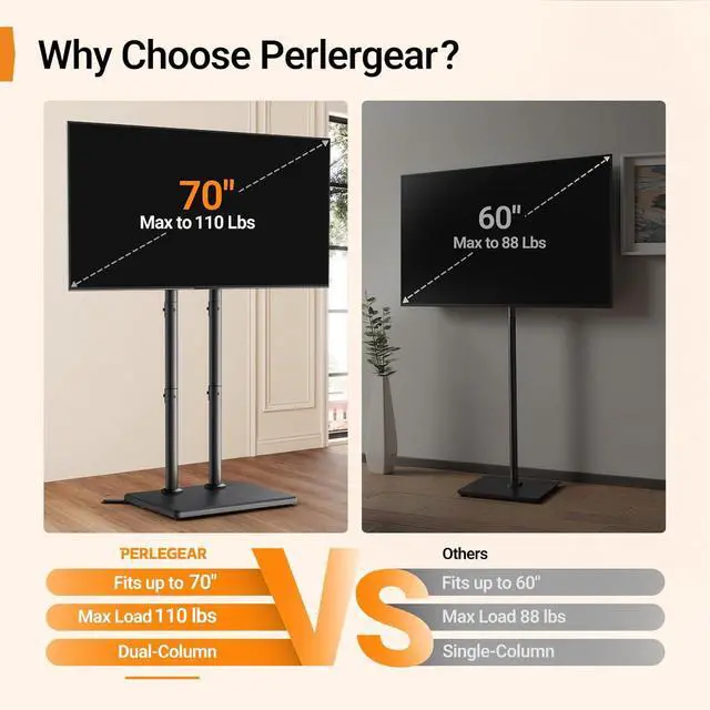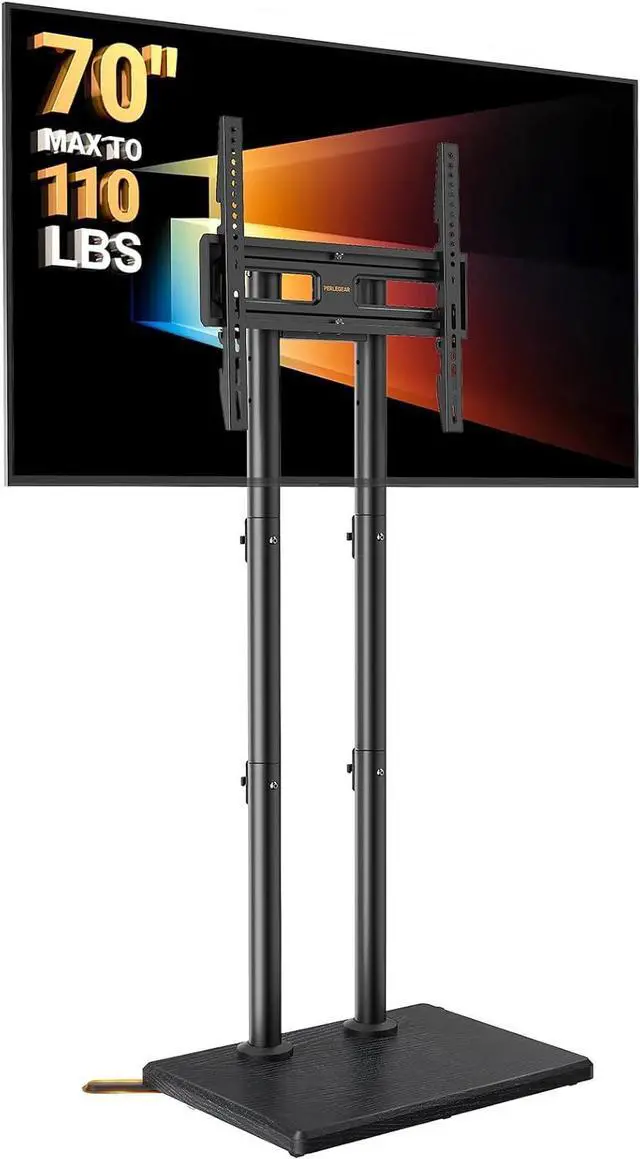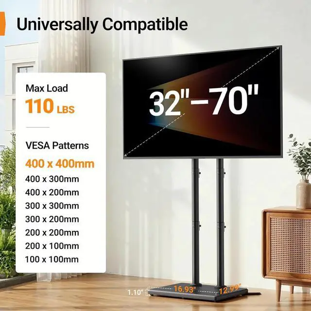 Universal Fits 3270 TVs The floor TV stand with mount fits flat or curved 3270 inch TVs (including 32/ 39/ 40/ 42/ 43/ 48/ 49 /50 /55/ 60/ 65/ 70) weighing up to 110 lbs with VESA mounting patterns from 100x100mm to 400x400mm. Please verify the size weight and VESA pattern of your TV before purchase9 Adjustable Heights for Perfect Viewing ComfortThis tall TV stand features 9 height settings ranging from 42.42 to 46.36 allowing precise positioning to achieve the ideal eye-level viewing from your sofa or bed. Whether sitting or lying down it easily adapts to different furniture setups.