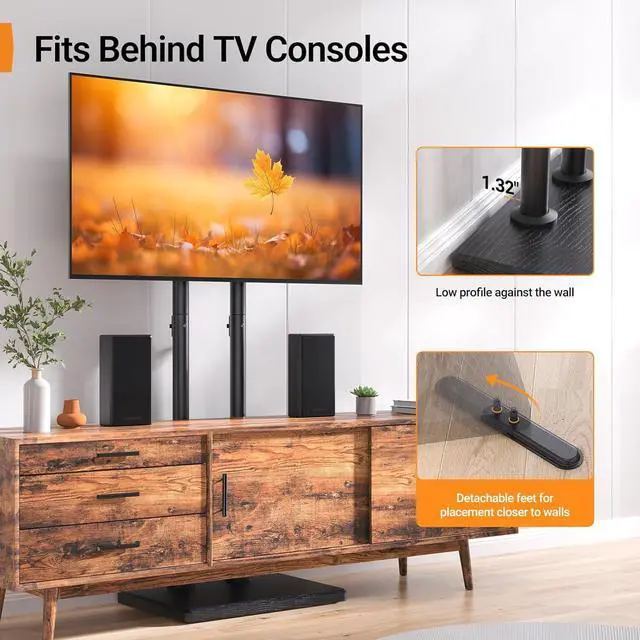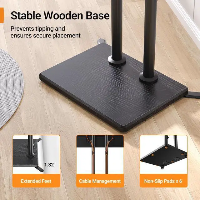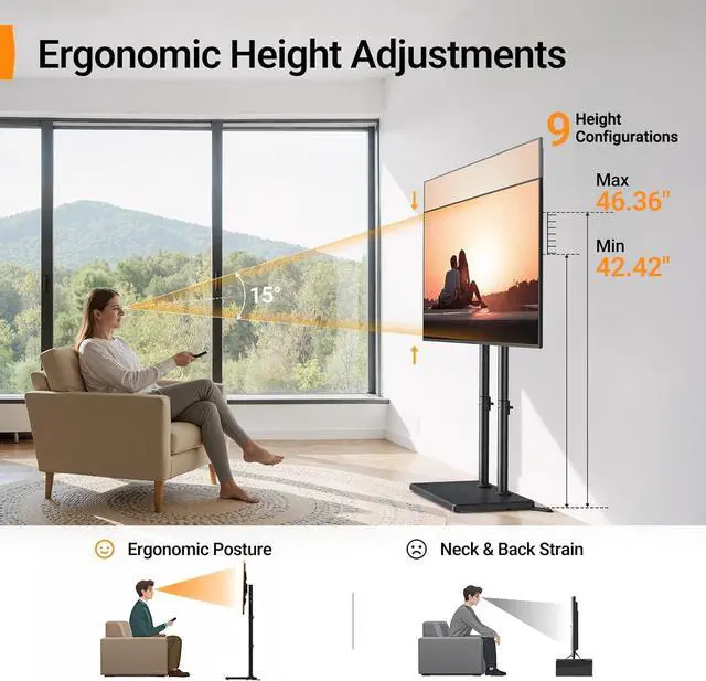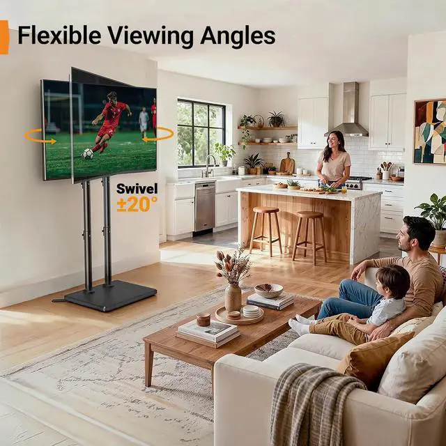 The ergonomic design helps improve posture and reduces neck and eye strainSmooth Swivel for Comfortable Viewing in Every SeatThis portable floor TV stand features a ±20° swivel. Whether youre on the sofa in bed cooking in an open kitchen or at a backyard party it helps reduce awkward side angles and screen glare for a more comfortable viewing experience. Built with a reinforced stable structure the TV stays secure and balanced during movement giving you confidence in everyday use anywhere in your home