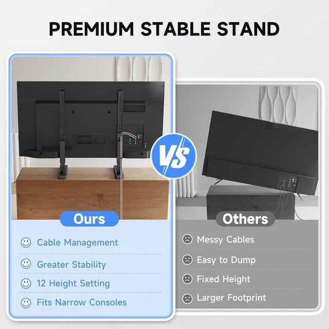 COMPATIBLE: The tabletop TV stand can fit most 24-86 inch flat or curved screen TVs and monitors. VESA 100x100mm-800x600mm.