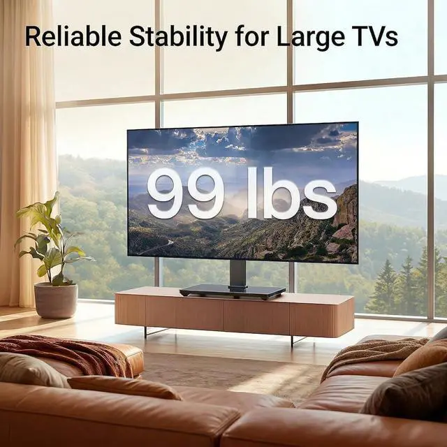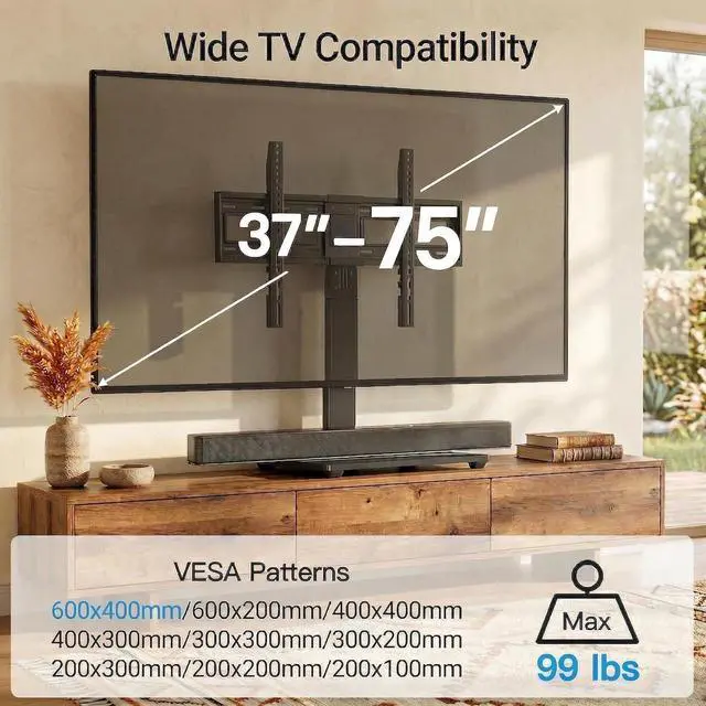Fits VESA (mounting hole pattern): 200x100mm (8x4) 200x200mm (8x8) 300x200mm (12x8) 300x300mm (12x12) 400x300mm (16x12) 400x400mm (16x16) 600x200mm24x8and 600x400mm 24x16. Swivels 60° To Find The Best Viewing PositionThis swivel tv stand is designed with the function that conveniently swivel 30° right or left. This universal tv stand with mount allow you to easily choose the healthiest viewing position available and watch TV no matter where you are in your family room. Customize your home theater experience. 9 Height Adjustment Positions & InstallationPERLESMITH universal TV stand base makes your life easier. 9 different positions and total 8 of height movement is perfectly for the TV it was needed for. Highest level fits Large TVs and lowest level to keep it from tipping. This 75 inch tv stand legs is also super easy to install within 15 mins without any hassle and comes with a clear instruction. Strong Mount Safely Holds Up To 99lbsThis adjustable VESA TV stand securely holds 99lbs and wont tip over or fall down. Durable high-quality steel construction ensures increased safety. Black tempered glass base adds a nice sleek appearance to your home. Durable Stand With Us Based ServiceThis television tv stand is made from the highest quality most durable steel construction so you can rest assured your TV is in safe hands.