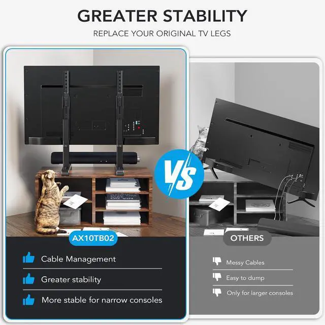 Compatibility - This universal TV stand is compatible with VESA hole patterns of 100 x 100 mm up to 800 x 500 mm (4 x 4 to 32 x 20) and Maximum weight capacity of 150 lbsHeight Adjustable - With 7 levels of height adjustment this TV bracket is specially designed for you to establish an improved TV height and viewing angle. Higher mounting options allow space to add a sound bar or other accessoriesAnti-Scratch Pads Prevent Sliding - This heavy duty curved TV stand is equipped with padded feet to help protect furniture surfaces and prevent slidingEasy Installation - With simple and clear instruction manual you can install this universal table top TV stand in very little time.