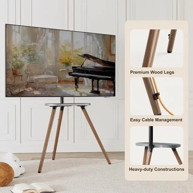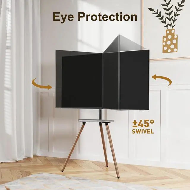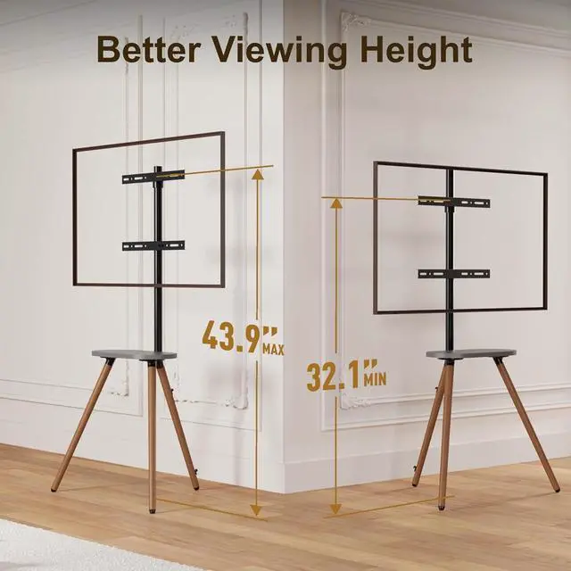 Enjoy comfortable ViewsBy using the ergonomic height adjustment function you can adjust the TV to the correct level for your eyes. This TV tripod stand's bracket allows for a 45 degree left and right swivel which could prevent light reflections. An swievel TV stand is beneficial in preventing painful in your eyes and neck muscles for long time. Sturdy Materials with FSC-Certified WoodThis easel TV stand is constructed of high-quality metal and FSC-Certified wood supporting up to 77 lbs (35 kg) of TV weight. It has passed rigorous UL/TUV laboratory testing at three times its rated load capacity.