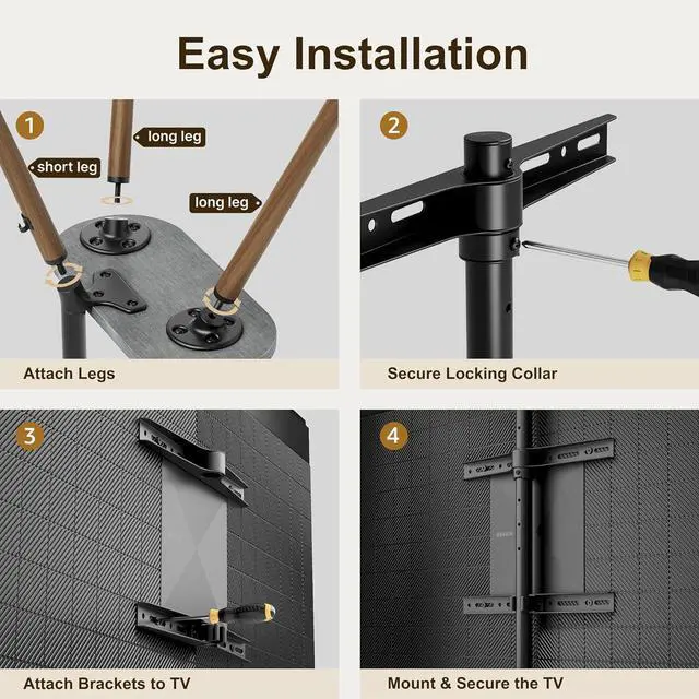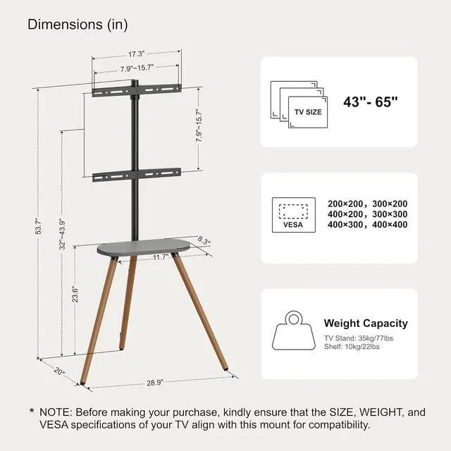 For added safety an anti-tip pull cord is included to help protect your family and children. Despite its solid build the stand remains easy to move from room to room. Fits all Your TV's SizeThis minimalist easel TV stand is perfect fit for 43''to 65'' inch LCD/LED TV screen. Whenever you upgrade your TV to a larger one this TV stand will be with you every step of the way. It features a versatile VESA range including 200x200 300x200 400x200 300x300 400x300 and 400x400mm. Make the smart choice for your home entertainment setup and experience the difference firsthand.