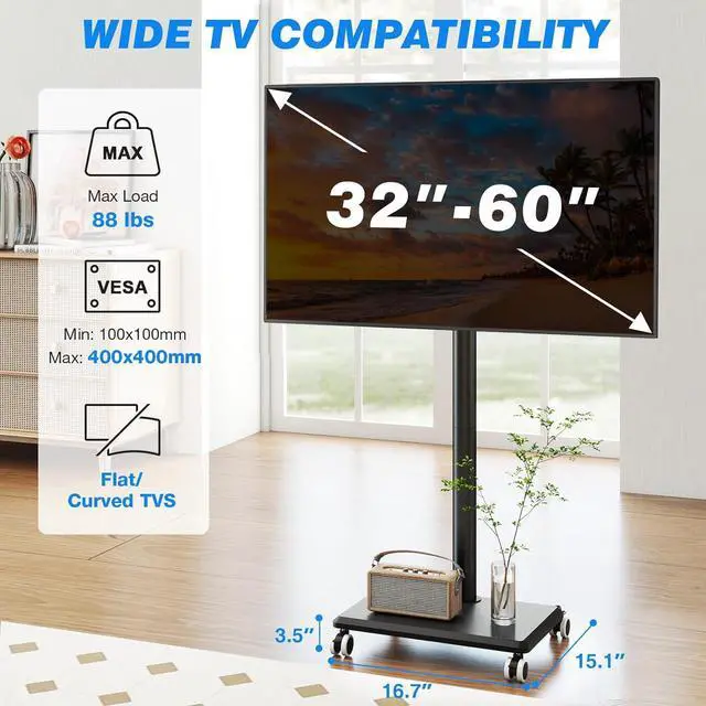 Compatible with 32-60 TVs - This mobile tv cart designed for 32-60 flat/curved TVs with 88lbs weight capacity and VESA 100x100-400x400 compatibility. please verify your TV's size weight and VESA pattern before purchase. 70° Swivel -