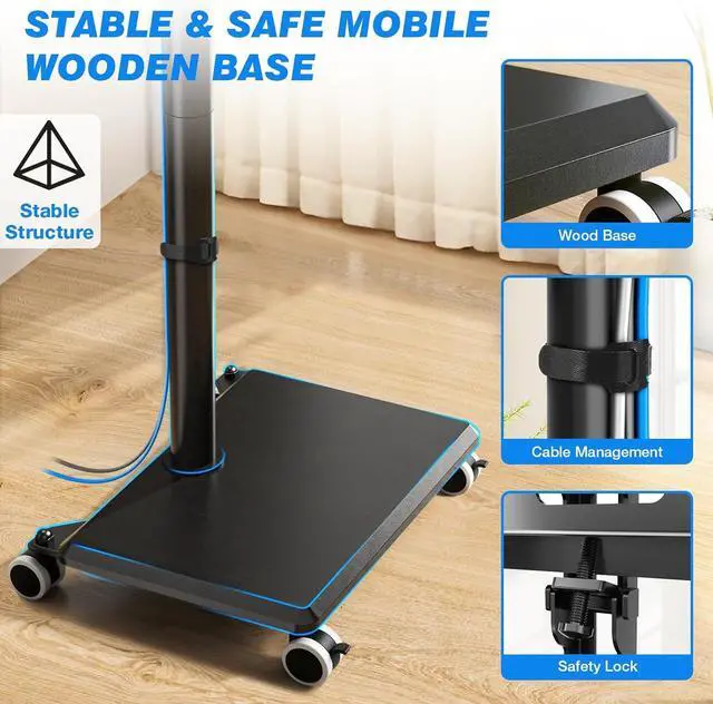 Minimum Area Maximum Safety: The swivel floor tv stand featuring a compact 16.7 x 12.8 x 1-inch wood base unlike glass bases that are prone to breakage this base ensures the safety of you and your family. It has a much smaller footprint than other stands making it ideal for tv stand with wheels. The reinforced steel frame combines with the solid wood base to provide superior stability. This innovation not only outperforms the competition in terms of stability and durability but also protects your TV in the event of an accidental impact making it ideal for families with children or pets. Upgraded 360° Rotating