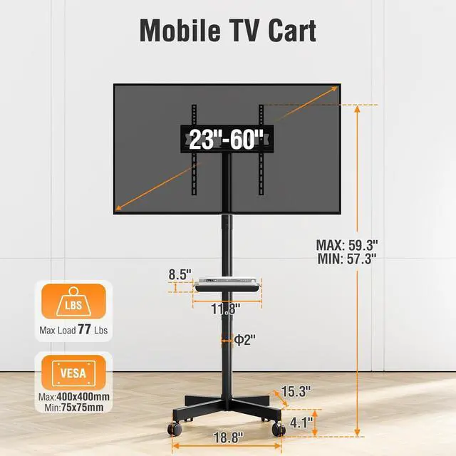 Universal TV Cart: Mobile TV stand can fit most 23 to 60 LCD/LED/OLED Flat/Curved screen or monitor with VESA from 75x75 (3x3) -400x400mm (16x16). Adapts to most of the TVs used in homes and offices.