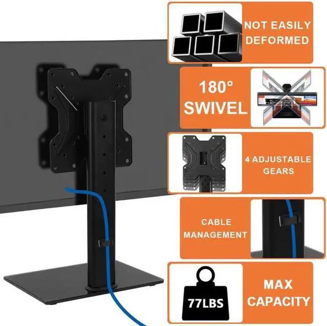 universal tabletop TV stand fits 19 to 43 inch TVs with VESA pattern from 75mmx75mm to 200mmx200mm holds up to 77LbsMulti-angle adjustment TV stand offers ±45° swivel and 4 level height adjustmentSafe and convenient to usehave cable management to keep cords clean and organized have Non-slip mats to Protect your desktopFree standing Desk Tv Stand It Place and use no need to punch holes in the wallEasy to assembleyou can install it in 10 minutes We provide all the necessary tools