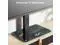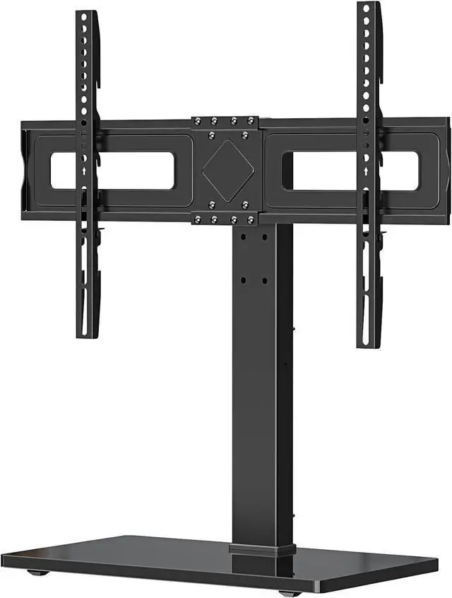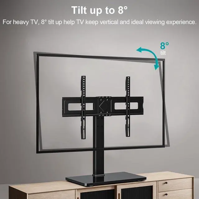 The TV mounting brackets can also be adjusted at 3 height levels by 1.77 to satisfy different applications or TV sizes. SWIVEL & TILTING ANGLE ADJUSTMENT - This table top TV stand can tilt upwards 5°. The TV plate can easily swivel 20 degrees left or right making it possible for you to get an optimal viewing without being restricted by the location. STABILITY AND SAFETY - The whole mount structure is made from heavy-duty steel materials together with the high-quality tempered glass base provides a stable and safe holding for your TV; The safety lock screw prevents the TV from falling off and the glass base has 4 rubber pads to avoid skidding.