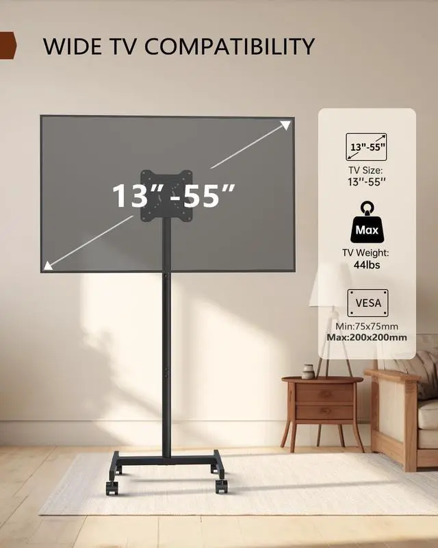 Universal Compatibility: Our rolling TV stand is Compatible with most 13-55 inch LED LCD OLED TVs including Smart TVs. The TV cart supports VESA mounting patterns from 75×75mm up to 200×200mm. It provides secure support for TV up to 44 lbs.