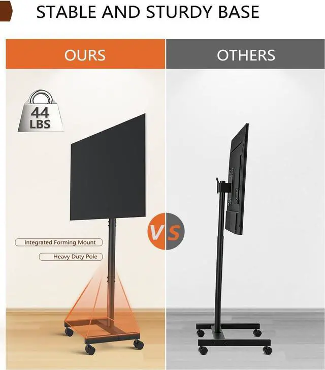 Stable & Secure: The rolling TV stand is built with a heavy-duty steel frame the stand safely supports TVs up to 44 lbs for reliable stability. The wide low-profile base and low center of gravity prevent tipping while 4 lockable wheels keep the stand firmly in place once positioned.