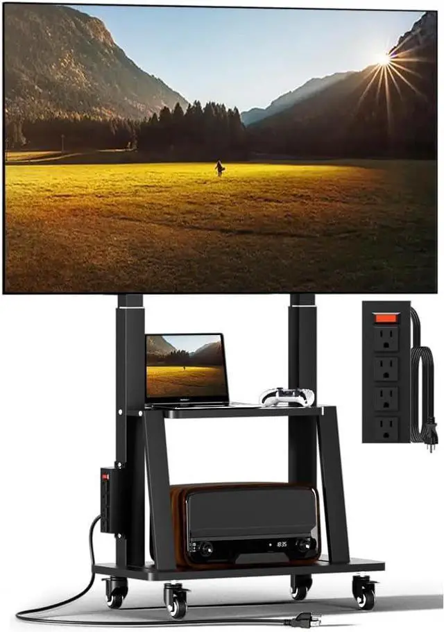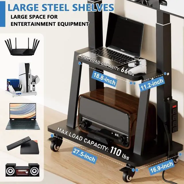 Mobile TV stand with Power OutletThis Duiliuu TV cart is equipped with a built-in power outlet with 4 AC outlets (125V/12A) and a 6.5 ft power cord for easy connection to a wall outlet to say goodbye to messy wires and a one-button switch that turns it off when not in use which can prevent children from touching it and other problems effectively. Sturdy and compact TV cartOur rolling TV stands are made of strong sturdy frames and solid metal construction. This reliable heavy duty mobile TV cart with wheels can hold up to 130 pounds. The upper shelf has a maximum load capacity of 66 pounds and the lower shelf is 110 pounds which can can place your projectors game consoles DVD players sound bars on the shelf.
