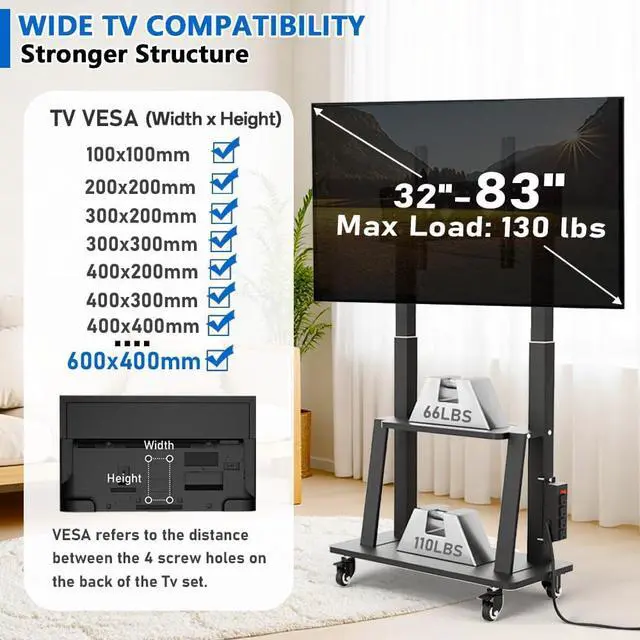 COMPATIBLE WITH MOST TV This portable TV stand with wheels is designed to fits 32 40 42 43 50 55 60 65 70 75 83 flat-panel LCD/LED TVs with a maximum TV weight capacity of 150lbs and is compatible with all VESA mounts from 85x32mm - 600x400mm. This rolling TV stand is adjustable with height from 53 and 59 so you can choose the height that you want. Movable and LockableThe wheeled TV stand is equipped with 2 inches heavy-duty 360° moving casters all 4 of which have brakes to lock the cart allowing it to be fixed or moved when needed.