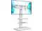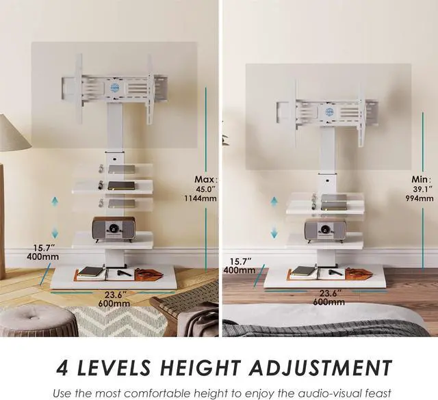 White TV Stand: This white floor TV stand mount with constitutes sturdy pole and stable iron base and shelves the overall color offers you simple and comfortable feeling perfect decoration for your roomTilt & 30 Degree Left/ Righe