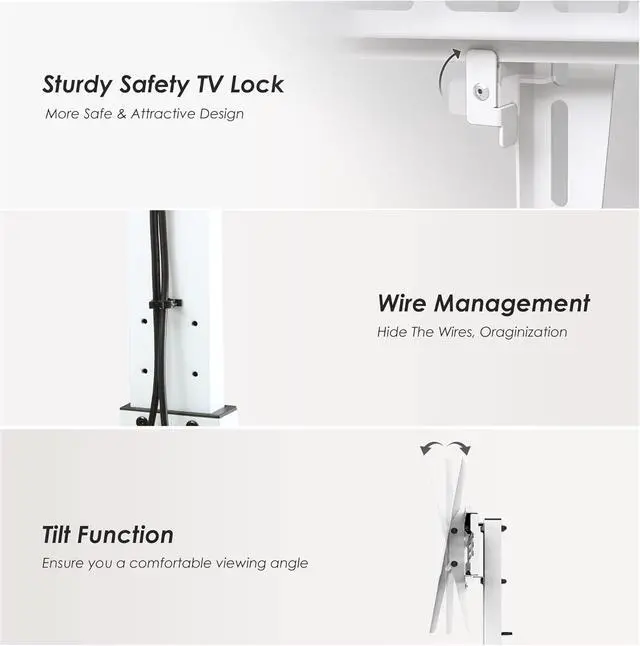 Swivel Mount: FITUEYES TV mounting bracket features unique modern design and white hooks it is easy to hang your TV. The TV mount could tilt from 5 degree to -15 degree and swivel 30 degreemax angle left or right which always ensures you a comfortable viewing angle. Integrated Safety Lock also protects your TV from dropping offFlexible Shelf &